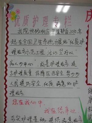 为加强优质护理活动工作宣传,急诊科在输液室增设了别具特色的宣传板报,主要有优质护理专栏、健康宣教栏、专家简介、医护天地等板块,由急诊科护士亲自设计、书写、绘图。