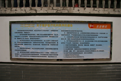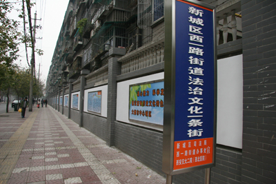 为适应新形势新任务对法制宣传教育的新要求,根据中央、省、市、区《关于在公民中开展法制宣传教育的第六个五年规划(2011---2015年)的通知》文件精神,按照新城区司法局、西一路街道办事处统一安排,在院领导的大力支持下,我院与新城区司法局、西一路街道办事处共建法制文化一条街普法长廊。该普法长廊设在我院南院家属区南围墙外,内容主要有中国司法、法律法规、医疗卫生、中华人民共和国卫生部和公安部关于维护医疗机构秩序的通告、交通事故中医疗费用有关规定、社会保障、青少年教育、安全生产、婚姻知识、生活常识等方面法律法规,以展板形式采取你问我答、寓教于乐、漫画等方式进行法制宣传和教育,帮助广大市民学法、知法、懂法,做到法律心中常驻,形成自觉学法、用法、守法、护法的良好法制氛围,促进社会和谐进步,为加快建设富有历史文化特色的国际化大都市中心城区营造良好的法治环境。