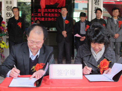 2012年10月24日,院领导谢丹、对外服务部副主任杨增尚及我院神经外科、心血管内科、小儿内科、妇产科、骨科等专家教授前往铜川市宜君县,举行我院与宜君县医院协作签约、授牌及医疗技术交流仪式。并进行大型义诊活动。