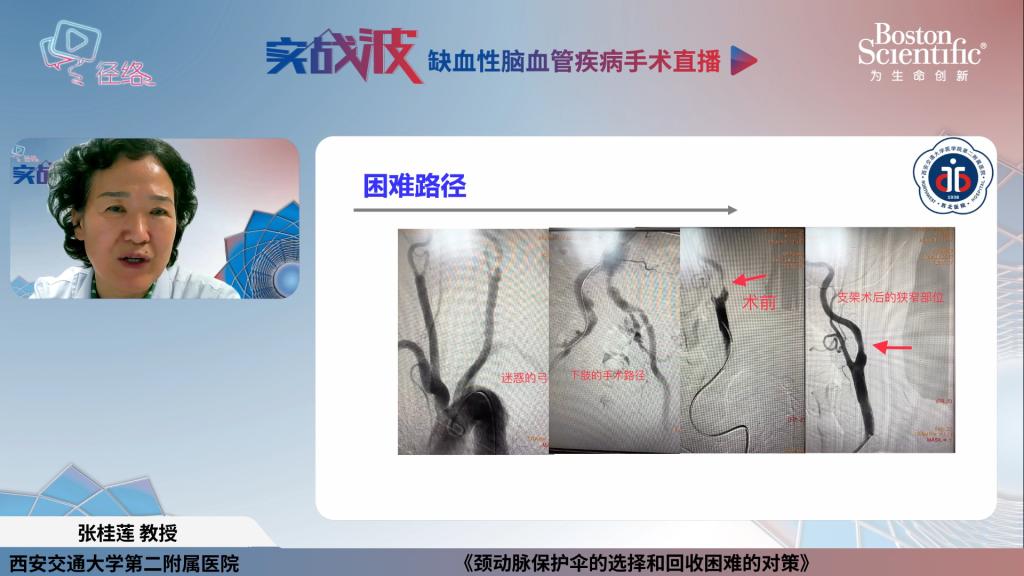 本次会议共设置我院神经内科、南昌大学第一附属医院、武汉市第一医院三家国内优秀神经介入中心手术演示。张桂莲教授主持手术直播,并围绕此次会议主题在线分享了“颈动脉保护伞的选择和回收困难的对策”学术讲座,张茹副教授在线直播演示了一例高难度颈动脉狭窄支架置入术,王虎清副教授担任手术实时解说。