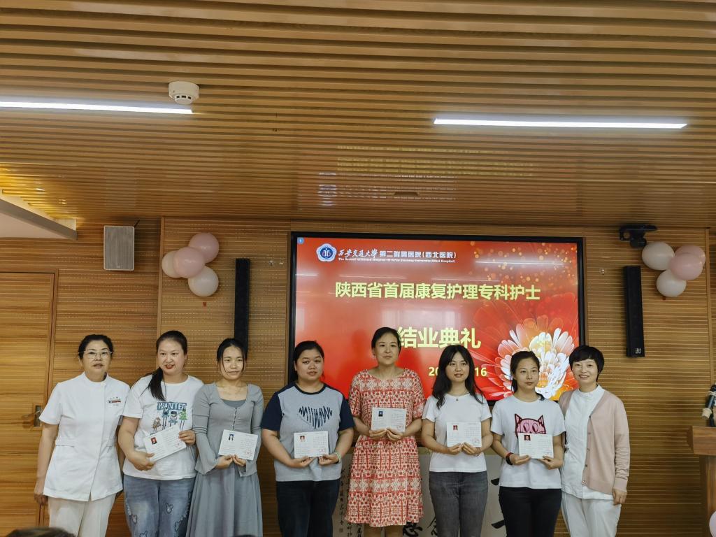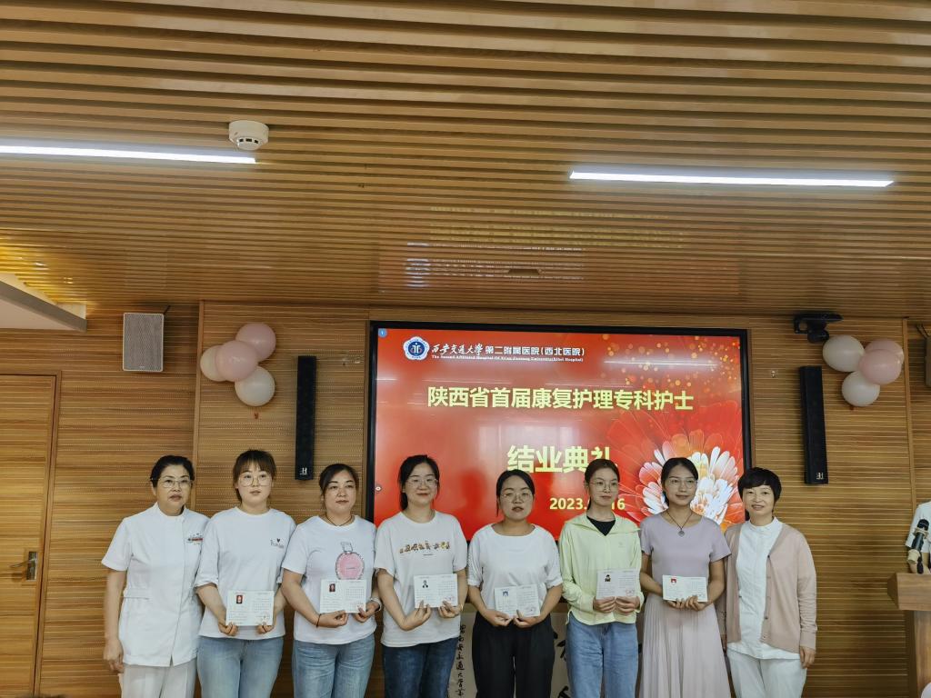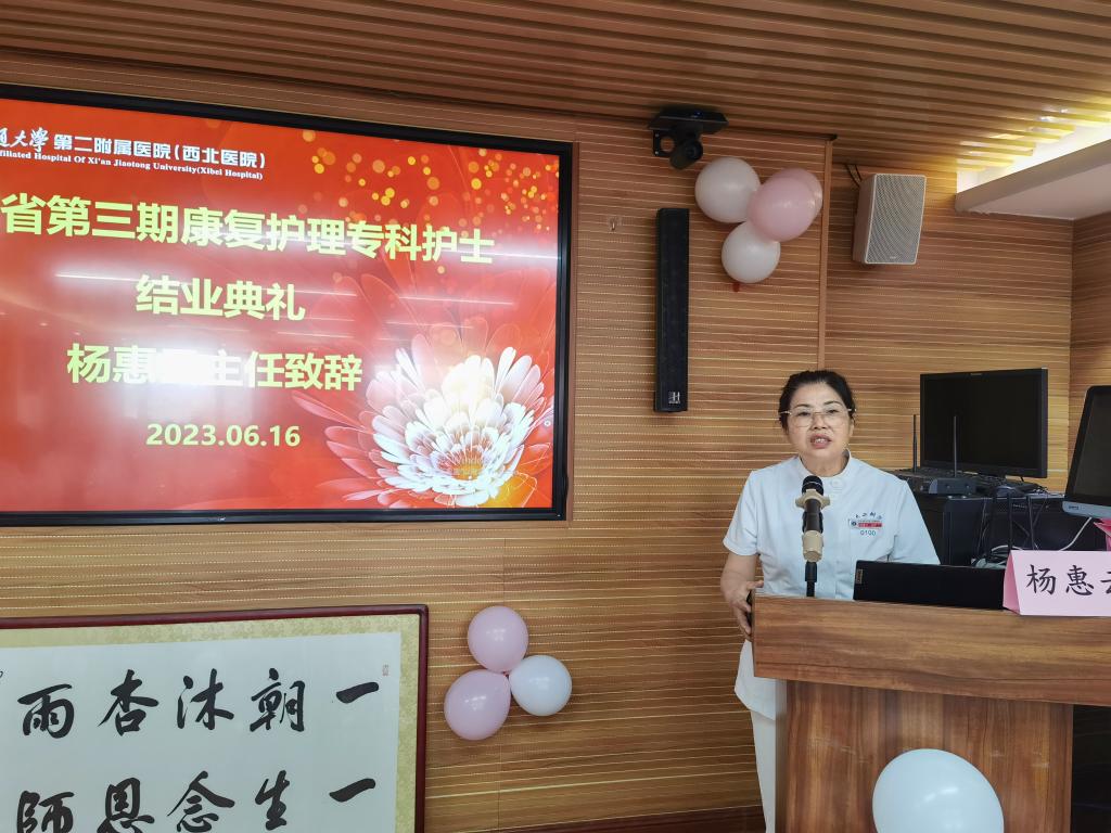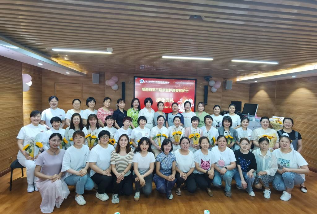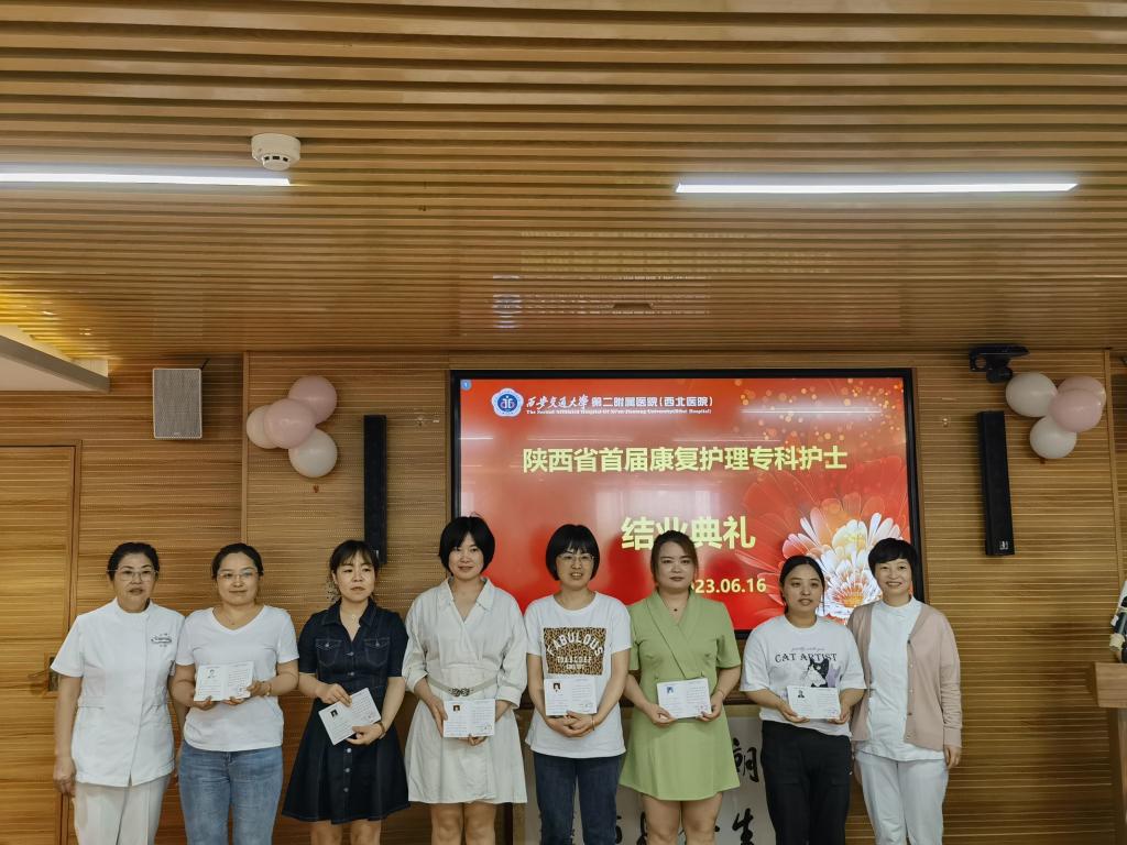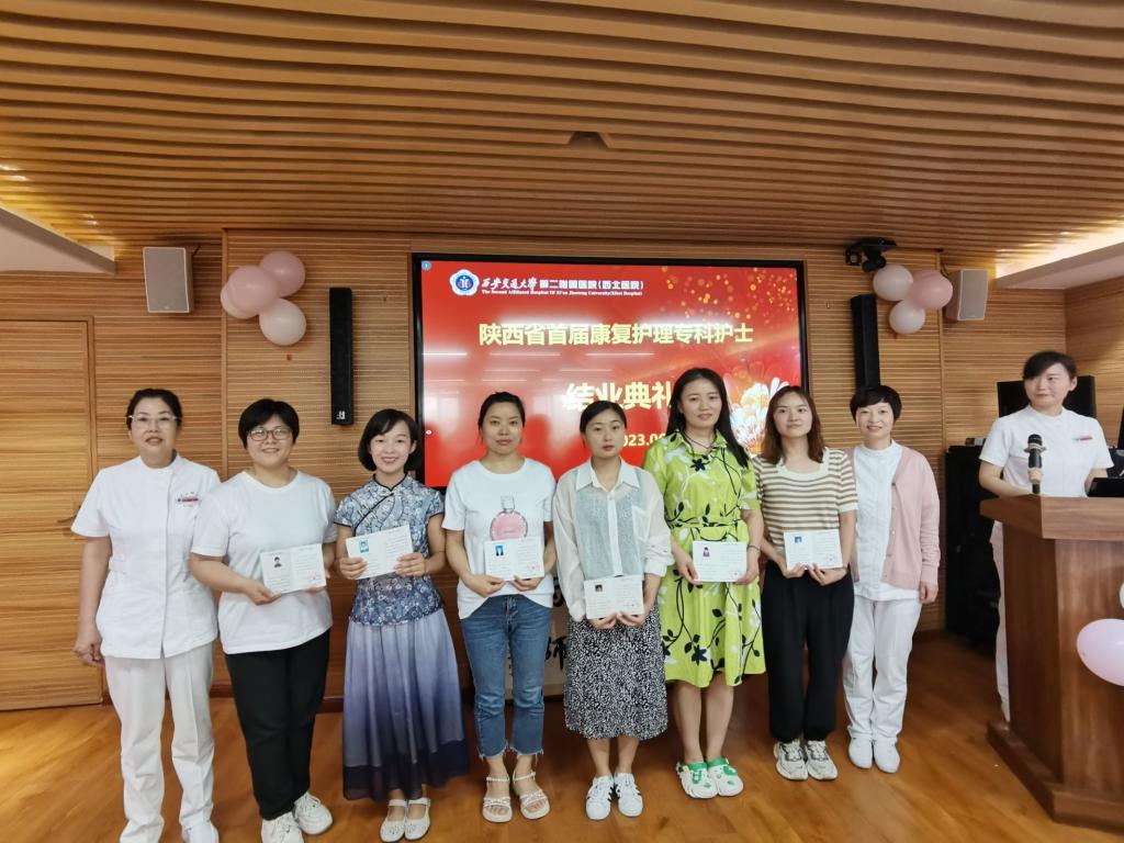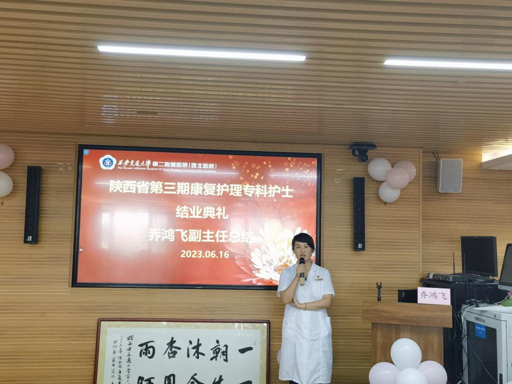 2023年6月16日,陕西省第三期康复专科护士培训班毕业典礼在西安交通大学第二附属医院举行,西安交通大学第二附属医院护理部杨惠云主任、姚聪副主任,康复医学科乔鸿飞教授,陕西省康复医院护理部潘红芳主任,空军军医大学第一附属医院康复科曹辉护士长,空军军医大学第二附属医院康复科路乐带教组长,高新医院康复科任瑜、靳晓璐带教组长以及二附院参与此次带教工作的各个兄弟科室的护士长、科室代表受邀参加了此次毕业典礼。康复医学科杨峰护士长主持典礼。