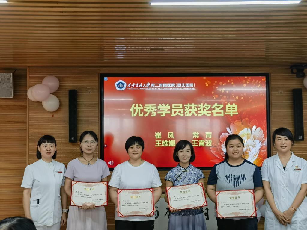 本次培训班班主任王茉莉主管护师从基地介绍、政策支持、培训模式、基地管理、师资力量、教学保障、文化建设等八个方面对交大二附院基地和本次培训班进行了总结汇报。优秀学员代表王维娜发表毕业感言。杨惠云主任和姚聪副主任代表交大二附院基地为各位学员颁发了培训证书。