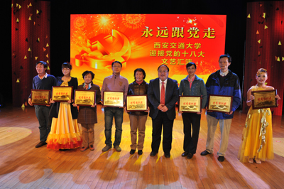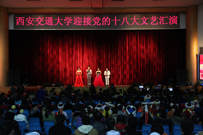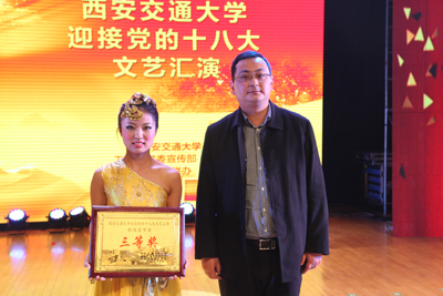 弘扬爱国情,喜迎十八大。2012年11月7日晚,西安交通大学宪梓堂内欢歌笑语、座无虚席、气氛热烈,学校迎接党的十八大文艺汇演在此开演,我院由党委副书记、工会主席黎一鸣带队带来了精心排练的歌伴舞节目。