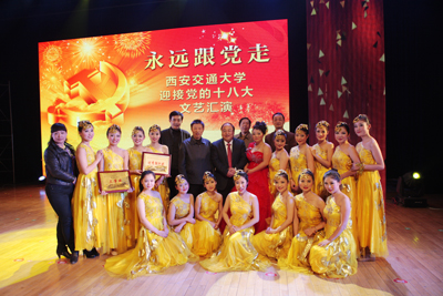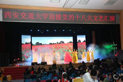随着西安交通大学迎接党的十八大文艺汇演大幕徐徐拉开,舞台上大型LED屏幕“永远跟党走” 背景图像闪亮会场。来自学校各学院的22支代表队为汇演带来了精彩的节目。在热烈的氛围中,我院选派的歌伴舞《节日欢歌》出场,演员们轻姿曼舞,优美娴熟,舞动的金色长裙在鲜红如火的郁金香背景下映衬得异常欢悦奔放,金弦的领唱高亢饱满,热情欢快的旋律唱出了节日的欢乐。演员们洋溢的甜美笑容,给在场观众留下了深刻印象。演出结束,我院选派的节目取得较好成绩并获得优秀组织奖。