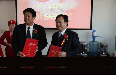 随后,贺西京院长同马柏林院长就后期协作、建立一套完整的协作体系设想和目标进行了广泛深入的探讨协商,决定双方将通过年度“医院协作与发展论坛”,增强管理层和科研技术层之间的交流沟通能力;通过定期手术指导、疑难病例会诊、危重病人抢救转诊,建立一套完整的协作体系;充分利用我院科研优势、人力资源优势,协助附院各项科研项目的申请工作,为附院人才培养和学科发展建路搭桥;通过我院各重点学科的对口协作指导,力争在合作期限内,将附院有关科室帮建成为国家临床重点专科和省级重点学科。