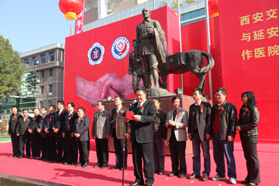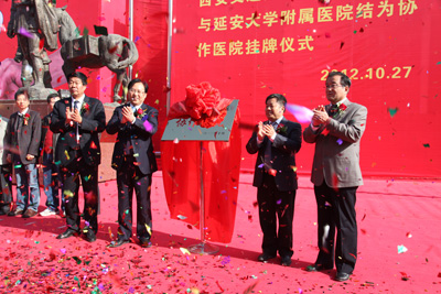 我院贺西京院长在讲话中表示,将以我院的10个国家临床重点专科学术优势为核心,开展定期协作活动,包括派专家前往延大附院进行医疗技术指导、疑难病会诊、手术指导,为附院医务人员提供免费进修培训等,建立紧密的协作关系,促进各自在医院管理、人才培养等方面的相互交流,充分发挥各自的资源优势,努力巩固各自在区域医疗中心中的龙头地位,更好的服务地方经济和社会发展。延安市副市长郝宝仓、我院院长贺西京、延安大学校长崔智林和延大附院院长马柏林一起为“西安交通大学第二附属医院和延安大学附属医院协作医院”铜牌揭牌。