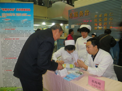 义诊现场热闹非凡,很多患者听到义诊的消息,上班之前就早早在门诊大厅等候。张巧俊教授、乔鸿飞副教授、袁海峰主治医师,护士李艳、李坤颖,研究生张李娜等医务人员耐心细致地为每位前来问诊者详尽检查、回答他们提出的各类问题,并根据具体病情制定具体预防及治疗、康复训练方案。本次义诊共接诊患者近百人,发放脑卒中防治健康知识材料200余份。同时,为便于大家了解脑卒中防治知识,义诊现场摆放了科室精心制作的脑卒中防治知识宣传展板,介绍了脑卒中的危险因素、防治措施、如何早期发现卒中、卒中后怎么办等等问题,使广大群众受益匪浅。