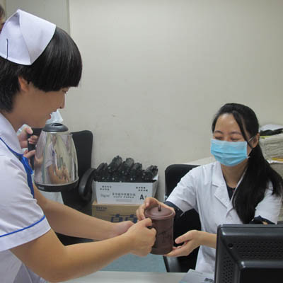 门诊部围绕“三好一满意”及“优质护理服务”活动,开展了形式多样的便民服务,于9月开始实行导医员为医生“送水到身边”温馨服务活动,门诊部的“温馨水壶”每日为全门诊医生送水,减少了医生去水房打水的时间,为门诊医生提供了方便。