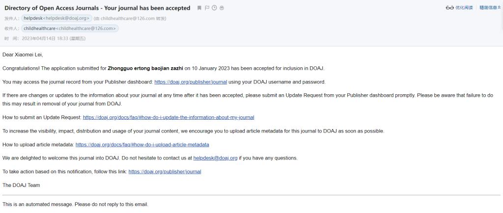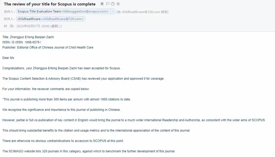 同时,杂志2023年被多家国际主流知名大型数据库收录,分别为:荷兰文摘与引文数据库(Scopus)、全球健康数据库(Global Health)、乌利希期刊指南(Ulrichsweb)、瑞典开放存取期刊目录(DOAJ)、哥白尼索引期刊数据库(ICI world of Journals)。