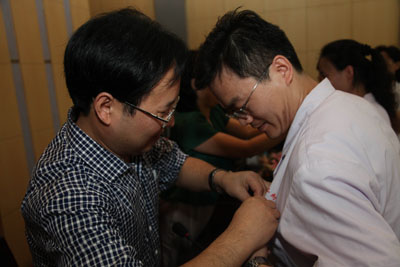 韦俊荣书记为新上岗医生代表佩戴胸牌并授予听诊器