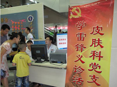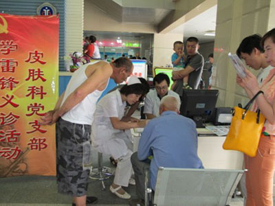 为响应院党委关于“深入开展学雷锋”活动的号召,充分发挥党员干部的模范带头作用,皮肤科党支部在支部书记高晓敏的领导下,结合皮肤科周一门诊量大,部分患者看病难的实际情况, 从5月下旬开始,于每周一上午10时至12时进行学雷锋义诊活动,逢门诊量少时暂停。此次义诊活动共4次,接诊患者约110 位,每次活动一名医生和一名护士参加,先后由李政宵和马迎新、郑焱和张苗苗、袁景奕和崔鹿、王晓鹏和张茹完成。参与的医生和护士认真对待每位患者,深入浅出、耐心细致地向患者讲解药物用法及注意事项等,深受患者的好评。义诊部分解决了周一患者挂号难、看病难的问题。