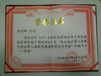 7月23 -27日,西北地区第六届暨甘肃省第七届医院感染管理学术年会在甘肃兰州召开。我院感染管理科李金娜、王红梅、王宁宁等所撰写的《ATP生物荧光检测法用于医院感染管理现场干预的研究》荣获大会交流论文中的一等奖。
