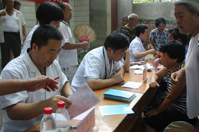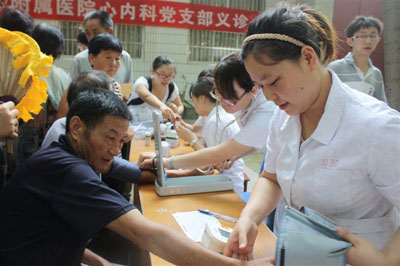 听说二附院的专家来义诊,数百名从四面八方赶来的群众早早就聚集在村委会前等候。上午9时许,医护人员一到义诊地点,就穿上白大褂,投入到紧张的工作中,前来就诊的群众络绎不绝,将整个义诊台围得水泄不通。义诊台前,段宗明教授等专家们冒着酷暑认真地接待每一位咨询者,耐心、细致地诊断,对病人耐心指点与帮助。另一边,护士们顶着烈日为每一位患者量血压、采血、进行血脂检查。一位70多岁的老人看完病十分感动地说:“我年纪老了,去城里看病不方便,今天你们这么多专家专程从城区来到这里免费给我们看病,让我们不出门就能享受到城里医师的治病,真让我们高兴啊!谢谢你们对我们的关心,真希望今后能常来。”在短短的两个小时中,共有一百余名群众前来咨询诊治。