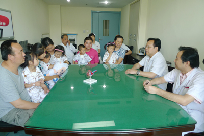 ? 6月15日,我院救治的首批5名由苗圃认助的先心病患儿李静鸽,孙菲菲认助的先心病患儿刘淼,冯远征、梁丹妮夫妇认助的先心病患儿齐鑫国、王曹俊,吴军认助的先心病患儿高智敏,经过十天左右的住院手术治疗,已经痊愈出院。