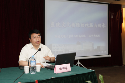 19日上午的会议中,巩守平副书记为参会人员做了题为《医院文化精髓的挖掘与继承——西安交大二附院文化建设工作交流》的精彩报告,报告从我院文化建设的精髓着手,指出二院人以服务患者、服务社会为宗旨,履行社会责任,在社会责任的基础上,彰显顽强拼搏、服务人民、团结奉献、开拓创新的医院文化精髓,以及我院文化精髓的传承。巩副书记还从我院历史、现状,医疗、教学、科研工作的进展,党建模式、服务理念、社会责任等方面结合实例全面介绍了我院在医院管理及文化建设方面的发展、理念和经验,报告内容丰富,形式新颖,获得与会人员的高度评价。