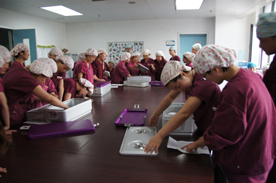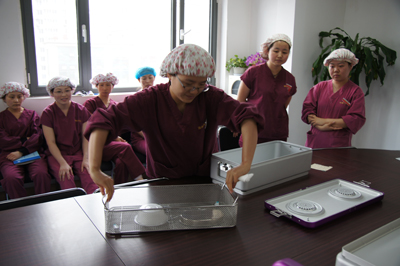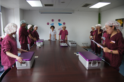 在科主任司慧君和护士长崔海燕的主持下,消毒供应科进行了全员培训,学习使用自动启闭式容器。和传统的包装方式比较,采用自动启闭式容器包装手术器械有以下优点:第一,它采用内置硅胶垫,能较好的固定器械,降低器械磨损,延长器械使用寿命;第二,它的金属外科能避免产生棉絮和微粒,保护使用者,为患者带来福音,这是传统的包装材料----无纺布或者纺织布所无法克服的;第三,自动启闭式容器灭菌有效期为6个月,比较现有的纺织品包布效期14天,效期更长,便于储存,节约能源;第四,它的外部设计合理,有适宜手抓的拉环让使用者体会到取放自如,以人为本,科学节力。