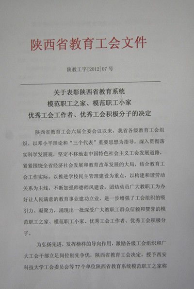 我院工会在2011年12月进行了评选活动的申报工作,依据陕西省教育工会提出的评选条件,从“团结动员广大教职工办好让人民满意的教育事业方面、增强工会组织的吸引力、凝聚力、信任感”等方面将5年来的工作进行了全面总结和申报,陕西省教育工会也派员考察了我院工会的各项工作及软硬件配套设施,最终决定将这两项荣誉授予我院工会及个人。
