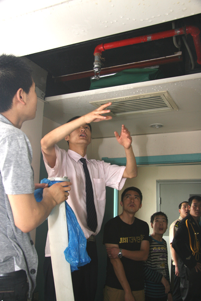 5月3日上午9点26分,我院综合大楼10层VIPA1012病房卫生间东侧上方消防喷淋头发生突然爆破,消防用水泄露。我院监控中心在接到通知后,迅速通知和调集人员。9点30分,在保卫部周康利主任、崔哲副主任的带领下,保卫部工作人员和欧博公司保安、保洁员数十人及时赶到现场。