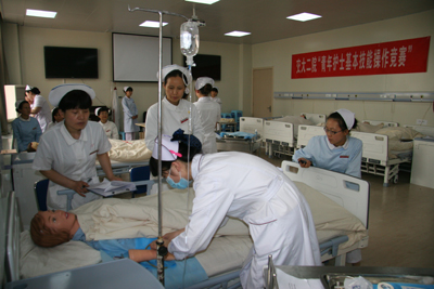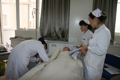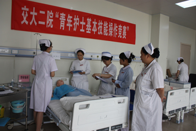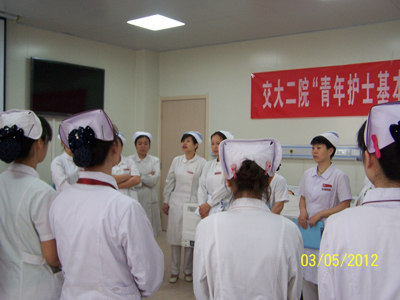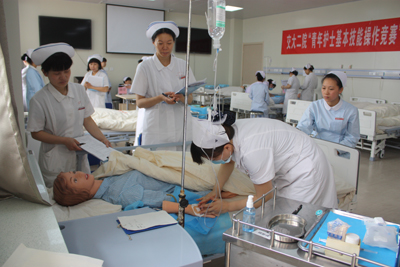 大赛从年初拉开了序幕,自通知下发之时起,护理部及各科室组织三年以下的青年护士进行12项护理基本操作技能(目前已完成的)的再培训和考核。装饰一新的示教室迎来了又一轮培训高潮,很多科室上班忙就利用晚上、节假日休息时间加班训练。4月份各科室组织预赛,有的科室对30余名青年护士,每人进行了12个项目的考核,有的科室反复多次考核层层选拔,全院449名三年以下护士,(除19人因生产、怀孕晚期、疾病原因未参加预赛外),全部参加了预赛,按10%的比例选拔出56人参加复赛(不足10人的科室给1名)。5.3日经过14个小时的激烈角逐17名护士获得了优异成绩,进入决赛,又经过半天的鏖战,10名护士脱颖而出。