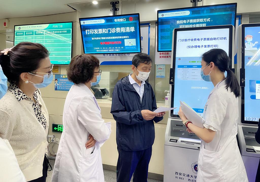 随后,调研组一行实地考察了我院电子发票自助打印区域和纸质票据存放区域,对自助机开具电子票据和纸质票据的领购、使用、存放等情况进行了详细了解。省财政厅收费管理处齐正宏处长对我院票据管理工作给予了充分肯定,并高度评价我院电子票据改革试点工作,为陕西省医疗系统全面推进财政电子票据改革提供了宝贵的经验。