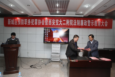 ?2012年3月2日下午,根据党委2012年工作要点总体部署,以及医院党风廉政建设的工作安排,纪委监察室组织安排了首批廉政警示教育活动。参加该活动的有院党政领导、党委委员、纪委委员、行政科室以及临床医技科室的部分正副主任、各党支部书记、重点岗位的工作人员共计120余人。西安市新城区检察院检察长、新城区预防职务犯罪协会会长马文,新城区检察院党组成员、纪检组长牟文,西安沙坡地区检察院副检察长、党组副书记袁省辉,陕西省未成年犯管教所纪委书记、三级警监翟学荣、省未成年犯管教所副所长赵长乐等出席。该活动在新城区检察院、西安沙坡地区检察院以及陕西省未成年犯管教所各位领导的支持配合下顺利完成。会议由我院党委副书记、纪委书记巩守平主持。