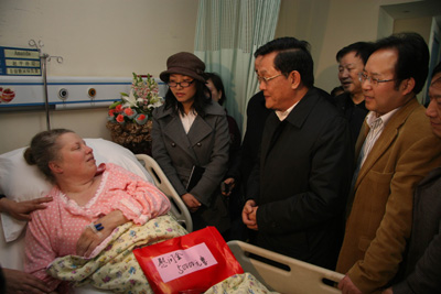 董军代市长一行来到消化内科病区,首先听取了主管医生马师洋对病情的介绍,贺西京院长向董军代市长介绍了我院对阿曼达女士所采取的全力救治、减免医疗费用、特别护理等一系列积极措施,并表示医院已经为阿曼达成立了以院长为组长的医疗小组,我们一定会用最好的医生和最好的医疗条件救治阿曼达。董军代市长在听取我院及市卫生、民政等部门对阿曼达住院的有关介绍后特别叮嘱一定要照顾好阿曼达的医疗、饮食起居,民政部门要照顾好海星之家的孩子们。董军代市长一行随后来到病房,俯身握住阿曼达得手说:你在西安8年来救助了数百名孤残儿童,很了不起,感动了西安百姓,我代表西安市政府和全西安人民感谢你!听说你患病我们很着急,很关心,今天特地来看你,希望你早日康复!董军代市长向阿曼达献上鲜花,递上西安市政府的5万元慰问金作为医疗费用。并安慰阿曼达说:你现在主要任务是配合医生治好你的病,请你放心,政府一定会全力照顾好海星之家的孩子们。阿曼达忍着病疼始终保持着微笑,一直用中文说:“谢谢!”这时她向董市长提出要求还都是和照顾她收养的那些孩子们有关的希望。