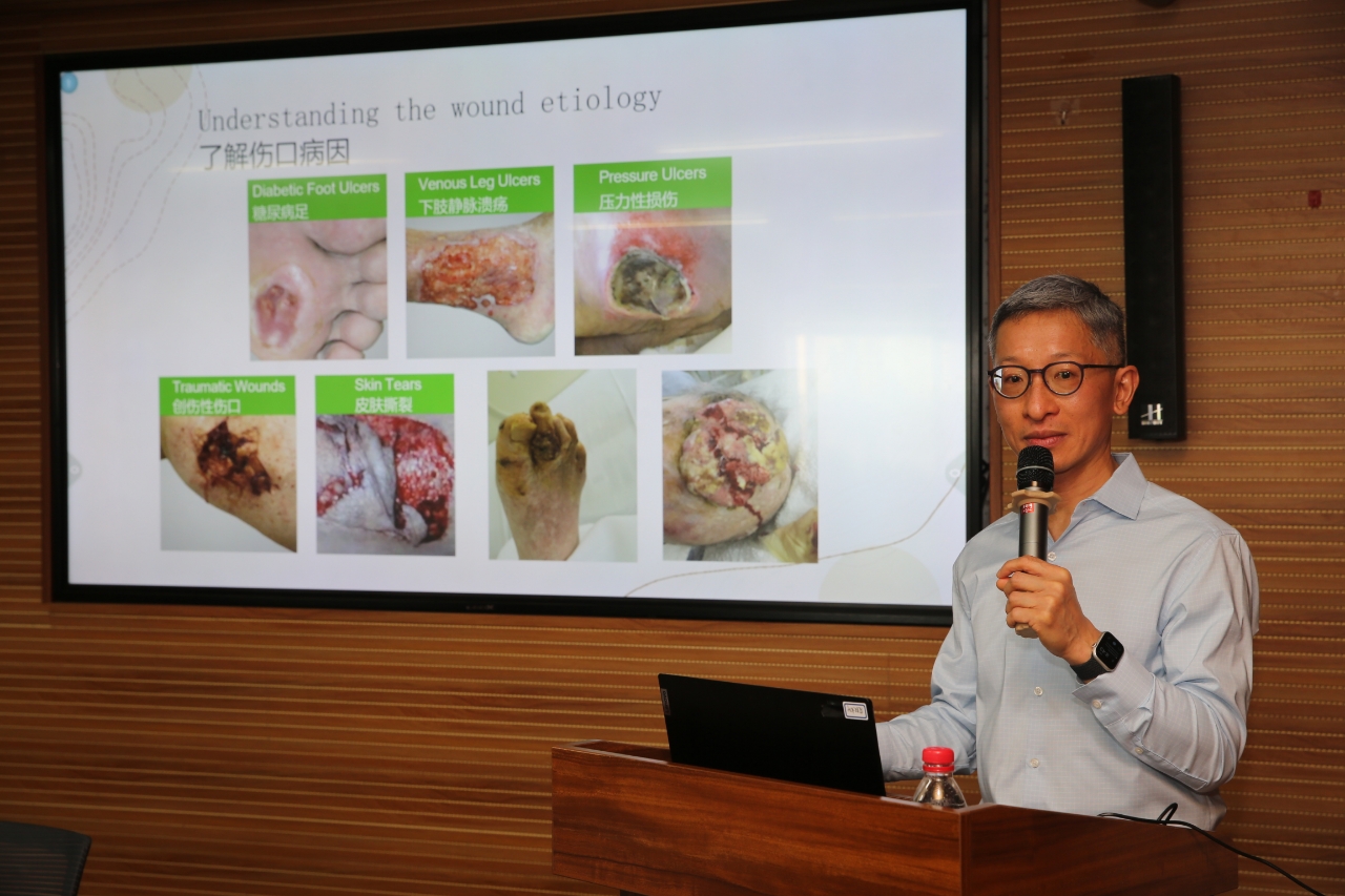 来自加拿大女王大学护理学院教授Kevin Woo的报告题目为“国际趋势:将伤口卫生融入主动伤口愈合策略之中”,他介绍了在面对难愈性创面时要认真评估、仔细分析、用辩证的思维来判断影响创面愈合的病因,积极采取针对病因的治疗,同时详细介绍了伤口卫生治疗四步方案“清洗—清创—重塑—贴敷”,并且现场对伤口卫生治疗四步方案以及下肢静脉溃疡与糖足的循环监测及干预策略进行了详细的操作演示,来自英国的Rachel临床主任专家分享了“将伤口卫生融入主动伤口愈合的策略之中”,强调了要根据组织类型积极施行伤口卫生,将“伤口卫生”被纳入到完整的评估-管理-监测框架中,按照创面基底组织类型开展伤口卫生标准四步法的创面床准备,进行针对性治疗,多轮预估并监测创面的愈合进展。期间专家们针对与会者提出的问题给予了积极的回答。在学术讲座结束后,护理部姚聪副主任对本次学术报告部分进行了总结,感谢两位专家不远万里传经送宝,同时也表示专家们的讲座将对促进我院伤口治疗和伤口护理技术的发展有着非常重要的意义。
