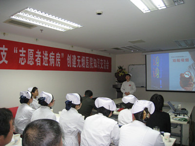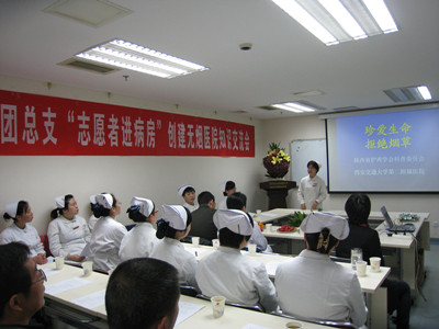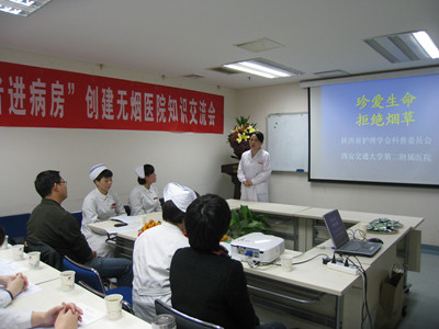 出席本次活动的有院团委书记王丽娟,副书记张成基,耳鼻喉病院、妇产、中医、皮肤、传染的护士长,第四团总书记王晔,团干部、团员及自愿到会的我院住院病人。会议邀请陕西省护理学会科普委员会秘书我院肿瘤病院副护士长姚聪进行知识讲座,就目前吸烟的状况、带来的危害、戒烟的必要性,以及如何劝阻吸烟,对戒烟的正确评估及戒烟措施等方面进行了详细的科普知识讲解。会中第四总支的团干们还为到场的病人及家属准备了“戒烟糖”,会场气氛热烈,互动频频,患者和医务工作者受益匪浅。