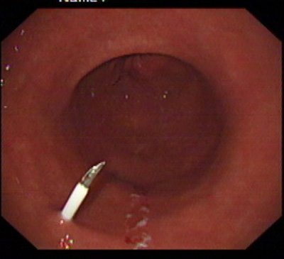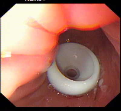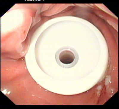 该患者系男性,76岁,脑出血后留有吞咽困难后遗症,不能自主进食,需长期留置胃管供给营养,严重的影响了病人的生活质量和原发病的恢复。经皮内镜下胃造瘘术(Percutaneous endoscpic gastrostomy,PEG)是一种无需常规外科手术和全身麻醉的造瘘技术,可以在胃镜室或病房局麻下进行,因此是一种操作简便、创伤小、安全可靠的方法。该例患者在胃镜室局麻下进行手术,手术过程约10分钟,术后病人无明显不适,3天后即可从造瘘管给食物并出院。