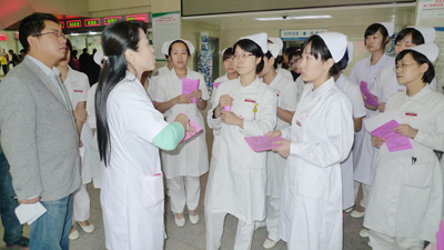 此次志愿宣传活动的启动仪式在门诊大厅内举行,青年志愿者们身着工作服,个个意气风发,团委书记王丽娟给志愿者们说到,此次活动属于“三好一满意”活动的一部分,志愿服务工作作为其中一项重要的考核指标,能否出色完成要靠我院青年团员们的共同努力才行,她希望广大青年团员们能积极地投入各项志愿活动中,在活动中锻炼自己、提升自己、完善自己,在奉献中充分地体现自己的价值。通过预约挂号的宣传,缓解挂号窗口的运行压力,优化患者就诊的流程。门诊办主任吴世学教授代表门诊办全体工作人员对参加此次活动的青年志愿者们表示感谢,同时祝各位青年人在平常的工作中一切顺利,最后他宣布活动正式开始。