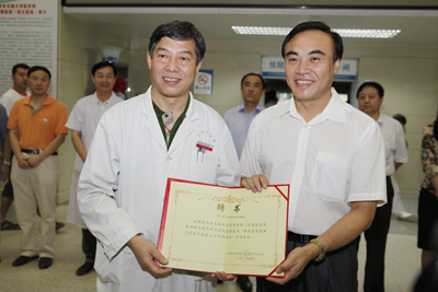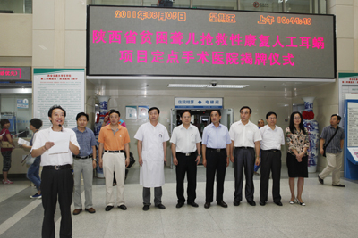 省卫生厅医政处处级调研员任成旭宣读卫生厅和省残联的批复,省残联康复部贾乃荣主任宣读聘书,省残联党组副书记、副理事长杨帆向我院耳鼻咽喉头颈外科病院副院长许珉教授颁发聘书;省残联党组书记、理事长高合元与我院院长贺西京教授共同揭牌。在揭牌仪式上,省残联党组副书记、副理事长杨帆发表了热情洋溢的讲话,他指出,残疾人康复是党和政府为残疾人办的实事,作为特殊群体的残疾人最迫切、最急需解决的问题是康复,此项工作的开展,会使每一个残疾儿童迈上崭新的人生之路,给残疾患儿的家庭带来希望。我相信,西安交大二附院作为卫生部直属的大型综合性三级甲等医院,一定能够圆满完成此项工作。我院副院长高亚教授首先表示对各位领导的莅临表示诚挚的感谢,同时表态,作为承担该项目的定点手术医院,我们将在陕西省残联、陕西省卫生厅的领导下,规范管理,确保项目实施效果;优化就医流程,严把技术环节,为聋儿提供优质医疗服务;加强监督检查,做好信息报送工作,圆满完成此项工作,让聋儿患者看到、感受到实实在在的好处,为我国防聋治聋工作做出应有的贡献。