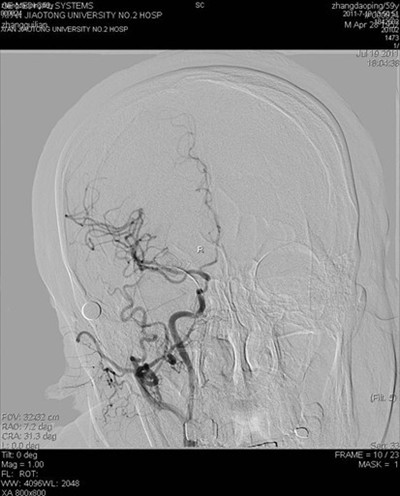 患者张某,59岁,以左侧肢体活动不灵14天入院,14天前患者突然出现左侧肢体无力,活动受限,并言语含糊,曾于外院就诊,脑CT及MR提示脑梗死,治疗后效果不明显,遂来我院。既往有高血压史数年,长期间断服降压药。入院查体:血压180/100mmHg,左侧口角低,左侧鼻唇沟浅,左侧上下肢瘫痪,肌力III+,左侧肢体共济运动差,左侧巴氏征阳性。余查体未见明显异常。辅助检查:空腹血糖9.8mmol/l。根据患者病史、外院影像学检查,考虑诊断为1.脑梗死(分水岭区);2.高血压病(III级,极高危);3.糖尿病(2型)。为了进一步明确患者脑梗死病因,确定下一步治疗方案,在家属签字同意下,于2011年7月19日进行了全脑血管造影术,术中发现右侧颈内动脉开口处闭塞,但远端血流通过后交通依稀可见,经过我科介入小组缜密讨论,拟给患者行闭塞血管再通手术,经过2小时的紧张手术,取得了很好的手术效果,患者安返病房(见图)。本次手术的成功,是继6月我们对急性闭塞血管进行取栓,我院神经介入工作的又一次突破,在血管闭塞后14天再通,在国内外少见报道,这将快速推动神经介入工作的进一步发展。