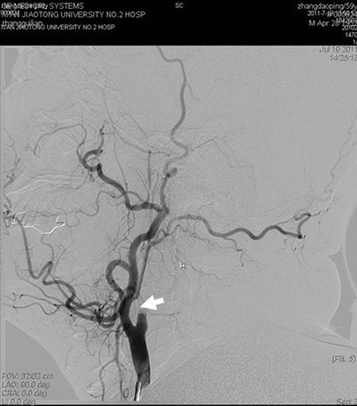 (图1) 造影见左侧颈内动脉开口附近闭塞(箭头所示),颅内血管未显影