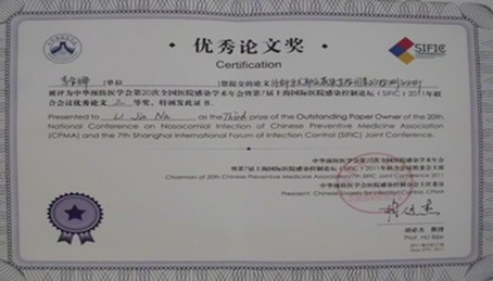2011年5月24-27日中华预防医学会第20次全国医院感染学术年会暨第七届上海国际医院感染控制论坛(SIFIC)2011年联合会议在上海召开。我院医院感染管理科李金娜、王宁宁、刘芳菲、王红梅撰写的《外科手术部位感染危险因素的监测与分析》论文获优秀论文三等奖及壁报设计奖,我院也是陕西省唯一一家被邀展示论文及获奖的医院。