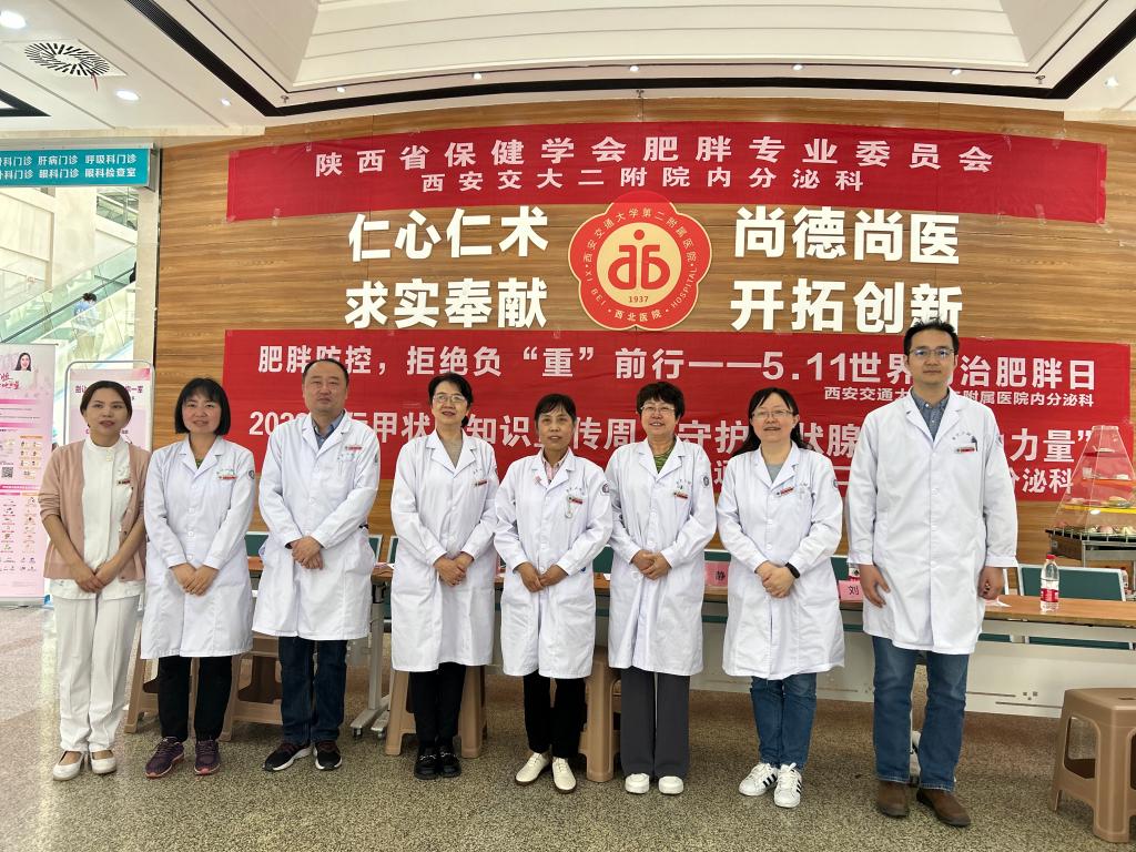 近年来,随着生活节奏的加快,工作压力的增强,甲状腺相关疾病患病率呈逐年上升趋势,严重影响公众健康。肥胖及其引发的糖尿病、心血管疾病、肿瘤、社会心理问题等已成为我国乃至全球最严重的公共健康问题,因此,为提高公众的甲状腺及肥胖的健康意识,普及甲状腺疾病及肥胖相关知识。2023年5月12日上午,内分泌科联合普外科在我院大明宫院区门诊大厅举行“肥胖防控,拒绝负‘重’前行”,“守护甲状腺,提升她力量”为主题的肥胖、甲状腺义诊宣传活动。