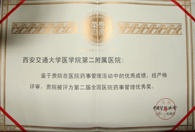 4月22日,中国医院协会药事管理专业委员会第四届委员会换届暨第二届全国医院药事管理优秀奖颁奖大会在武汉召开,我院荣获第二届全国医院药事管理优秀奖,陕西省仅有三家单位(第四军医大学第一附属医院、西安交通大学医学院第二附属医院、安康市人民医院)获此殊荣。