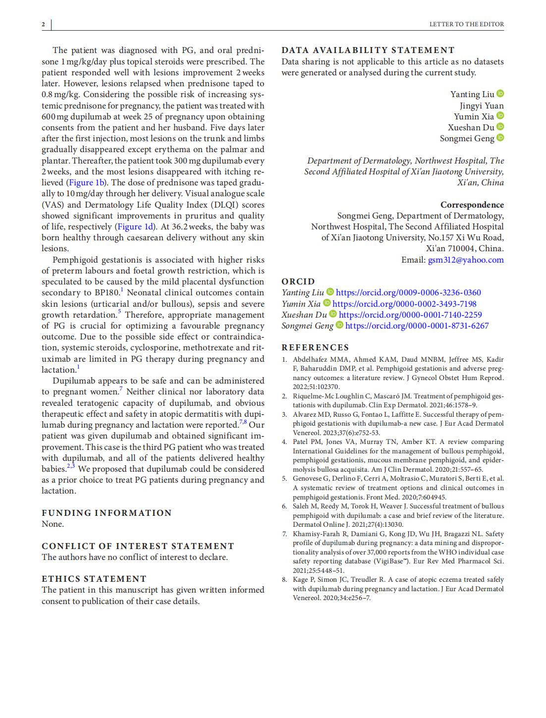 2023年5月18日,我院耿松梅教授团队在《欧洲皮肤性病学杂志》(JEADV,IF:9.22)在线发表了题为“A case of pemphigoid gestationis successfully treated with dupilumab”的临床病例报道,刘彦婷医师为第一作者,耿松梅教授为通讯作者。这是继“PRF1突变导致严重皮肤结核感染”之后,1个月内少见疑难病例诊疗再次被国际顶级皮肤病学术期刊JEADV接收发表。