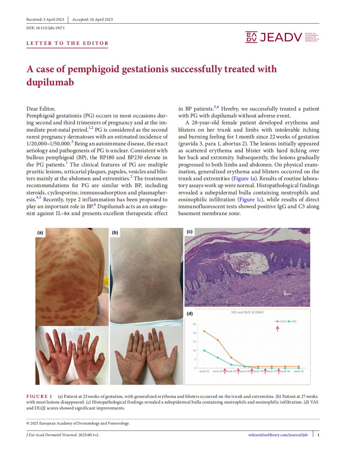 该病例是国际上第3例、国内首例报道的使用度普利尤单抗治疗妊娠疱疹的病例。在经过一年随访,证明了其安全有效性后,文章撰写投稿,并被JEADV迅速接收发表。