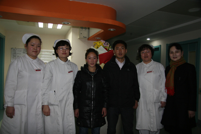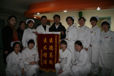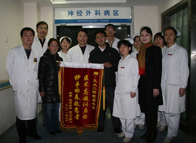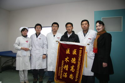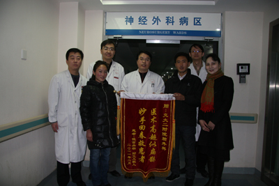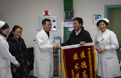 十二岁的藏族女孩德吉央宗在玉树地震中受伤,因开放性颅脑损伤、颅底骨折伤势较重被送进我院神经外科,她是我院收治的来自玉树地震灾区年龄最小的一名伤员,也是病情最为危重的患者之一,主管医生巩守平教授快速为小央宗完善相关术前检查,并及时地为其进行头部清创、手术治疗,使这位藏族小女孩脱离了生命危险。小央宗的病情曾一度让古城西安的每一位市民所牵挂,也是我院全院职工最为牵挂的一位藏族小同胞,她的健康恢复牵动着神经外科的每一位医务工作者的心。今天,财东受德吉央宗、财文及家人的委托,专程来到我院神经外科,献上了书有“医术高超似扁鹊,妙手回春救患者”的锦旗,以表达他们深深的感恩之情、浓浓的鸣谢之意,救治小央宗的神经外科巩守平教授接过锦旗,亲切地同财东、曲珍握手,一再叮嘱财东、曲珍要注意身体,并仔细询问德吉央宗、财文的身体状况、恢复情况,代问他们及家人身体健康,祝愿他们一切平安。真可谓灾难虽无情,人间有大爱!