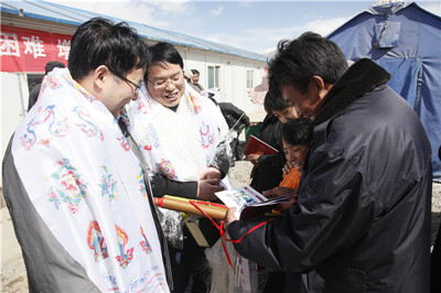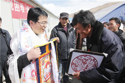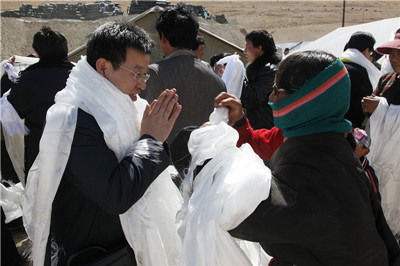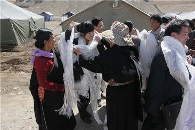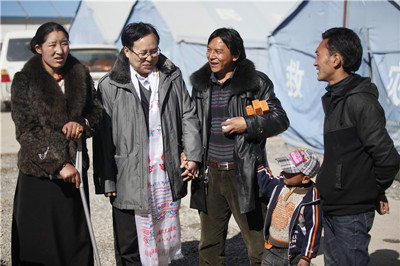 2011年4月9日下午3点,贺西京院长一行赶到玉树县医院,在这个帐篷围起来的临时医院门口,50多位曾在我院救治过的伤员和他们的家人早早的等候在门口,为远道而来的亲人献上洁白的哈达。问候声,道谢声,祝福声,朴实的语言表达出最真挚的感情,一张张熟悉而真诚的面孔让在场的每个人都为之感动。