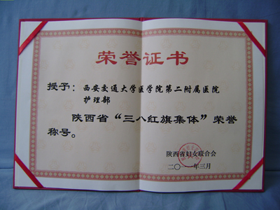 经院工会推荐,由护理部申报的西安交通大学第二附属医院护理集体获得“2011年陕西省三八红旗手(集体)”荣誉称号。2011年3月17日下午,由陕西省妇女联合会周玉峰副主席为我院颁发奖牌与证书。此次获得的这项荣誉是陕西省妇女联合会为表彰两年来,在全面贯彻落实科学发展观、构建和谐陕西和西部强省建设的伟大实践中,全省广大妇女大力弘扬“四自”精神,踊跃投身我省政治、经济、文化和生态建设所涌现出的一大批爱岗敬业、苦干奋进、追求卓越、无私奉献的杰出女性和女性群体而设立的。