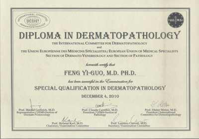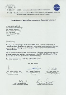 我院皮肤病院冯义国副研究员通过ICDP-UEMS考试并获荣誉证书,是中国大陆最早参加ICDP-UEMS考试并获得该证书的人。获得该项证书的医师,在世界各国可以合法从事皮肤病理诊断。