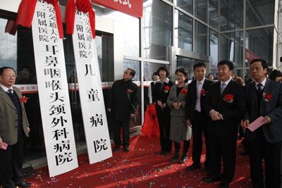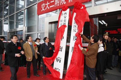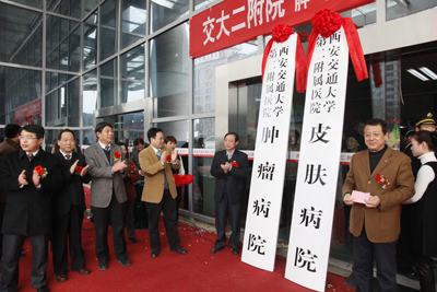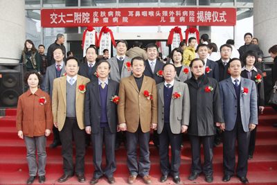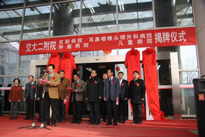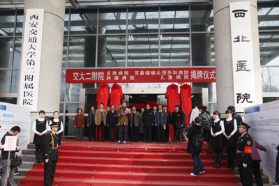 2011年3月23日上午,我院医疗综合大楼前彩旗飘动,气球高扬,人群欢声笑语,热烈祝贺西安交通大学医学院第二附属医院“皮肤病院、耳鼻咽喉头颈外科病院、肿瘤病院、儿童病院成立暨揭牌”的巨幅暄染着喜庆的气氛。陕西省卫生厅黄立勋副厅长、西安交通大学闫剑群副校长、颜虹校长助理、医学中心马兆明副主任莅临并为四个病院揭牌。我院党政领导和各病院院长、常务副院长以及全院各科室主任、护士长、医务人员300余人出席、参加仪式。仪式由院党委书记韦俊荣主持,院长贺西京致辞。黄立勋副厅长、闫剑群副校长发表了热情洋溢的讲话。同时,四个病院的20名专家教授为前来就诊咨询的200余名患者进行了义诊。