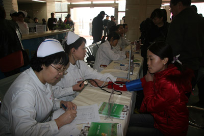 3月10日是第六个世界肾脏日,今年的主题是“保护肾脏,挽救心脏”。 根据陕西省医学会肾脏病分会的安排,3月10日上午,由我院肾病内科、宣传部、门诊办联合陕西省中医研究院、西安市第四医院、西安市中心医院、西安市第一医院著名肾病专家教授举办的大型义诊、咨询、宣传活动在我院综合大楼一楼举行。我院肾病内科桂保松教授、姚钢炼副教授、付荣国副教授、张星映副教授、马力群副教授、护士长卫小红、护士长周琳及主管护师马小琴、芦宁、张亚妮参加义诊活动。专家们现场为患者免费诊病、答疑解惑、免费监测血糖和血压等,共接诊350人次,免费测血糖、血压300人次,发放肾脏病健康手册及宣传资料400份。医护人员们耐心仔细的诊病、一丝不苟的为患者做检测、不厌其烦的讲解,受到了患者及家属的一致好评。(康芳琴/文 赵文颉/图)