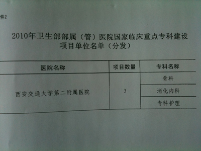 遵照国家卫生部2010年关于临床重点专科申报有关文件精神的要求,在卫生部和陕西省卫生厅的正确领导和统一部署下,我院分三批完成了16个专业国家临床重点专科评估申报工作,最终骨科、消化内科、专科护理三个专业荣膺2010年首批国家临床重点专科殊荣,并获资助1400万元,专科数量和经费数量均居西北地区第一。荣获此殊荣为我院拉开了国家级临床专科建设的序幕,为医院蓬勃发展奠定了新的里程碑,也为医院成为区域医疗中心打下了坚实的基础。
