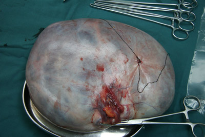 患者梁某,女,59岁,以 发现“卵巢肿瘤”40天余之主诉入院。查体:体温36.0 ℃,脉搏76 次/分,呼吸18次/分,血压110/70mmHg。心肺听诊无异常,腹膨隆如6月妊娠大小。辅助检查:B超(西京医院,2011.02.22):子宫声像图无异常;宫上方所见无回声:卵巢肿瘤(左右来源不清)。心电图(西京医院,2011.02.23):窦性心律偶见室性早搏;心电图提示:T普遍低平双相。初步诊断:卵巢肿瘤;偶发室性早搏。手术组经过细致的手术前检查和准备,于3月1日在硬膜外麻醉下行全子宫双附件切除术,手术由邢兰英教授主刀,范引侠副教授、樊江波主治医师等协助;患者心电图异常,引起麻醉科的高度重视,由经验丰富的赵亚琴副教授麻醉,手术室赵会利和刘雄涛配合。麻醉满意后取仰卧位,常规下腹术野消毒铺巾,取下腹左旁和正中纵形切口长约10cm逐层入腹,术中见:右侧卵巢呈囊实性增大,大小约35*20*15cm,表面光滑,子宫及左侧附件、右侧输卵管外观无明显异常。将右侧附件提出腹腔,切除。送快速冰冻病检检查,结果回报:粘液性囊腺瘤。切除全子宫及双侧附件,生理盐水冲洗腹腔,查无活动性出血,清点器械敷料无误后,常规逐层关腹,麻醉满意,手术顺利结束。手术结束后,患者长嘘一口气,激动地说:“终于把拖累我的害物切除了”。(手术室通讯员 李向利/文 刘铨/图)