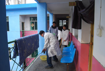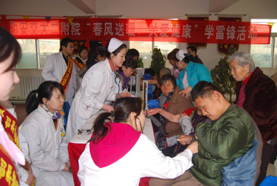 8点40分,在院团委的组织下,第一团总支、第三团总支、第四团总支和学生团总支组成的15人青年志愿者服务队抵达位于科技路西口的丰泽园老年公寓。在老年公寓志愿者们为老人们逐一测量血压、听诊并耐心地询问老人们的健康状况、日常饮食习惯等问题,针对个别老人有血压高、心脏有杂音等健康问题,随行的医生细致地用笔记本将治疗方案书写下来,交给老年公寓的院长。志愿者们来到房间内为行动不便的老人检查身体、聊天谈心;学生志愿者们则积极地为老年公寓打扫卫生。志愿者将雷锋精神传播到老年公寓的每一个角落。