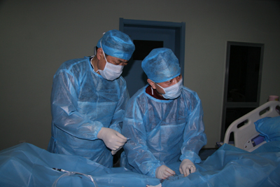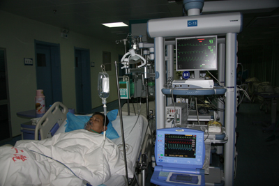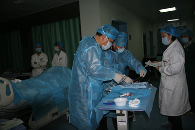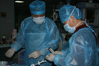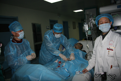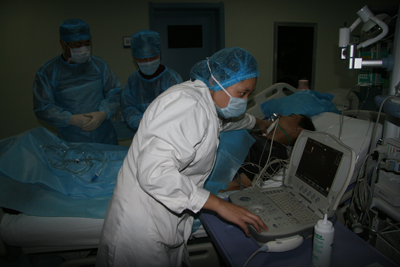 经过紧张的术前准备,由段宗明教授和韩振华副主任医师于4时30分给病人紧急施行主动脉气囊反搏术。由于病人长期患有糖尿病,血管变细,右股动脉穿刺失败。随即改穿左股动脉,穿刺成功后,植入8F动脉鞘,在超声医学研究室乞艳华医师的定位下,将主动脉气囊置于降主动脉,在心电及压力触发下进行主动脉气囊反搏成功。经过20多分钟的操作,手术成功,随即停用升压药物。一个小时后,病人的心率降到96次/分,血压升到112/70毫米汞柱,血氧饱和度上升到85,生命体征趋于平稳,情况正在向好的方向发展。
