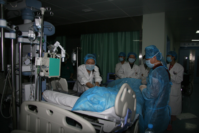 患者高某,现年55岁,发现有糖尿病6年余。近几天来感到胸前区有些不适,也未在意。12月8日下午4时许在单位工作时感到胸闷,经朋友劝说,在北郊辛家庙附近一诊所进行处理后返回单位,下午6时多症状人仍不能缓解。晚上12点多感到胸闷、气短和心前区疼痛,也无法平卧。立即被单位人员送往我院急诊科。急诊科立即给病人进行相应检查。发现病人的血压只有90/60毫米汞柱,心率达110次。心电图显示病人的心脏前壁大面积心肌梗死,心肌酶谱系列检查显示肌酸激酶和同功酶高出正常值3倍,肌钙蛋白高出正常值的10多倍。急诊科立即请心血管内科进行会诊,同时给病人进行相应的处理。正在值班的心血管内科住院总医师张春艳会诊后将病人紧急收入冠心病监护病房(CCU)。到病房后病人的情况越加严重,血压下降到80/50毫米汞柱,血氧饱和度从在急诊科的82左右下降到60-65之间,心脏功能衰竭,肺内布满湿鸣音,生命处于休克危急状态。正在病房的段宗明教授对病人紧急检查后立即指示给病人紧急应用升压药和甲强龙、奥克等药物,同时指示李永勤副主任医师等人请呼吸内科和重症监护科进行急会诊。呼吸内科刘昀主治医师和重症监护科刘敏龙主治医师会诊后提出相应处理意见。在给病人续用吗啡、多索茶碱等相应处理后,病人的血压稍有回升,但血氧饱和度上升较慢,只有70;心率仍快,达到110次左右。在此情况下,只有进行主动脉气囊反搏术才可能改善病人的症状。为了抢救病人的生命,段宗明教授立即指示由心血管内科韩振华副主任医师和张荣主管护师前来冠心病监护病房(CCU)进行主动脉气囊反搏术。