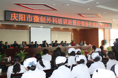 西峰区副区长刘建莉首先热烈欢迎远道而来的各位专家并发表了讲话。她讲到,庆阳市位于甘肃省的东部,辖7县一区,即西峰区,面积996平方千米,拥有35万人口,经济收入位居甘肃省第二位。各位专家的亲临指导不仅提高西峰区人民医院的整体医疗技术水平,也使西峰区人民以及庆阳市广大人民的健康有了更大的保障。我院对外服务部韩新生主任对西峰区人民医院这次举办的微创外科培训班表示祝贺并讲到我院有七十余年的发展历史,我院皮肤科、耳鼻喉科、消化内科、妇产科、骨科、泌尿外科、超声研究室等许多科室在西北乃至全国均有相当高的知名度,微创技术已经成为我院的品牌。两所医院的协作,将使西峰区及庆阳市人民群众在当地就能享受到三级甲等医院的医疗技术和服务,达到解决当地群众看病难、看病贵的问题。随后韩新生主任向西峰区人民医院授予协作医院牌匾。